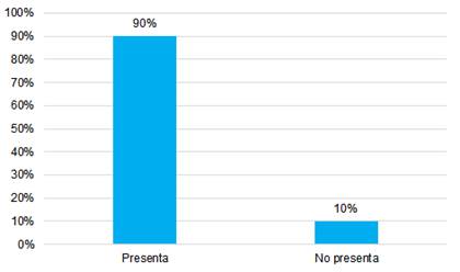 En lo que respecta al acaecimiento de síntomas relacionados con la disfunción social (Figura 4), se aprecia nuevamente que amplia mayoría de los médicos examinados exhibieron índices claros de disfunción social, situación que afecta de forma alarmante al 90% (f= 45) de los evaluados. Este escenario indica que el 90% de la muestra es incapaz de disfrutar de sus actividades diarias, de tomar decisiones con seguridad y, así mismo, es incapaz de interactuar eficientemente con las demás personas de su entorno. Por otra parte, solo el 10% (f= 5) restante no presenta síntomas visibles de disfunción social.