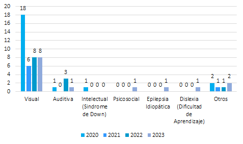A partir de los resultados obtenidos mediante la aplicación de los instrumentos a los estudiantes, se muestra la cantidad de ingresantes con discapacidad en la Facultad de Humanidades, Ciencias Sociales y Cultura en los años 2020, 2021, 2022 y 2023. En el año 2020, se registraron 22 estudiantes ingresantes con discapacidad. Sin embargo, en el año 2021, esta cifra disminuyó significativamente a sólo 7 estudiantes. En el año 2022, se observa un aumento en la cantidad de estudiantes ingresantes con discapacidad, llegando a 12. Y en el año 2023, se registra un aumento en comparación con el año anterior, con un total de 13 estudiantes ingresantes con discapacidad. La Figura 2 presenta un análisis de los datos estadísticos sobre los tipos de discapacidades presentes en los estudiantes ingresantes en la Facultad de Humanidades, Ciencias Sociales y Cultura Guaraní durante los años 2020, 2021, 2022 y 2023. Los resultados revelan la distribución de las diferentes discapacidades entre los estudiantes que ingresaron en cada año. En el año 2020, el tipo de discapacidad más común entre los estudiantes ingresantes fue la discapacidad visual, con un total de 18 estudiantes. Además, se registró la presencia de una discapacidad auditiva y una discapacidad intelectual (Síndrome de Down). También se contabilizaron dos casos de discapacidades clasificadas como “Otros”. No se reportaron casos de discapacidad psicosocial, epilepsia, idiopática ni dislexia. En el año 2021, se observó una disminución en la cantidad de estudiantes ingresantes con discapacidad. Se reportaron seis casos de discapacidad visual y un caso clasificado como “Otros”. No se registraron casos de discapacidad auditiva, intelectual, psicosocial, epilepsia idiopática ni dislexia.