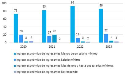 Figura 3. Ingresos económicos de los ingresantes de los años 2020 a 2023 de la Facultad de Humanidades, Ciencias Sociales y Cultura Guaraní.