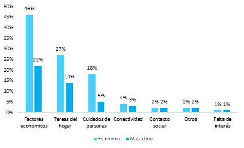 Como dato complementario, se consultó además la presencia de hijos en la vida cotidiana de mujeres y varones; el porcentaje de varones con hijos, coincidió con el porcentaje de varones que tienen a niños bajo su cuidado. Un porcentaje ligeramente superior de mujeres refirió el cuidado de hijos, frente a aquellas que en verdad ya tienen hijos, lo que podría estar explicado en el cuidado de otros niños además de los propios. Percepción de obstáculos para el aprendizaje Las mujeres reportaron una mayor percepción de obstáculos que afectan su desempeño académico. En promedio, la puntuación fue de 1,324 para mujeres y 0,526 para hombres, con una diferencia de 0,8 puntos. La Figura 1, refleja el análisis interno, en el que el factor económico fue el principal obstaculizador de los procesos de aprendizaje, en un 46% para las mujeres y 22% para varones, seguido de las tareas del hogar, y el cuidado de las personas como los 3 factores principales obstaculizadores. Este patrón se repitió en ambos géneros, aunque con mayor intensidad en mujeres.
