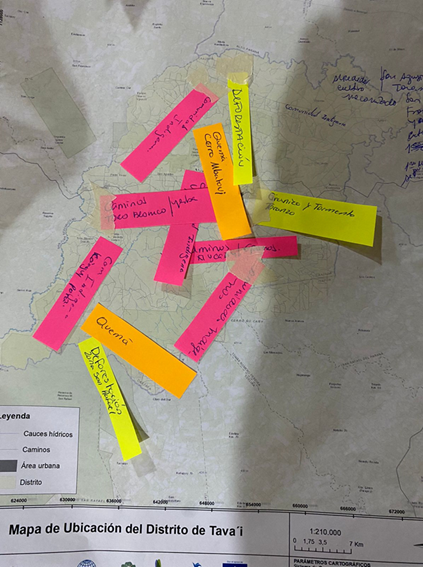 Resultados Para la primera categoría de análisis se señaló que los principales problemas del municipio de Tava’i, en una escala de mayor a menor, son la deforestación, seguida de sequías e incendios, granizadas y tormentas con lluvias severas. Respecto a las granizadas y las tormentas, manifestaron que constituyen fenómenos que en alguna medida les preocupa menos, pues ya conocen las acciones que se pueden tomar para proteger, por ejemplo, los cultivos. En tanto, sobre la sequía e incendios, manifestaron que son problemas graves, pero coinciden en que se deben en gran medida a la deforestación, esta ocurre, preferentemente, en los parques nacionales, pero no exclusivamente. En el mapa trabajado (Figura 1) señalaron tanto el norte como el sur como lugares críticos donde ocurre este fenómeno, lo cual coincide con la ubicación de los parques nacionales: Parque Nacional Caazapá y la Reserva San Rafael Tekoha Guasu (RSRTG).